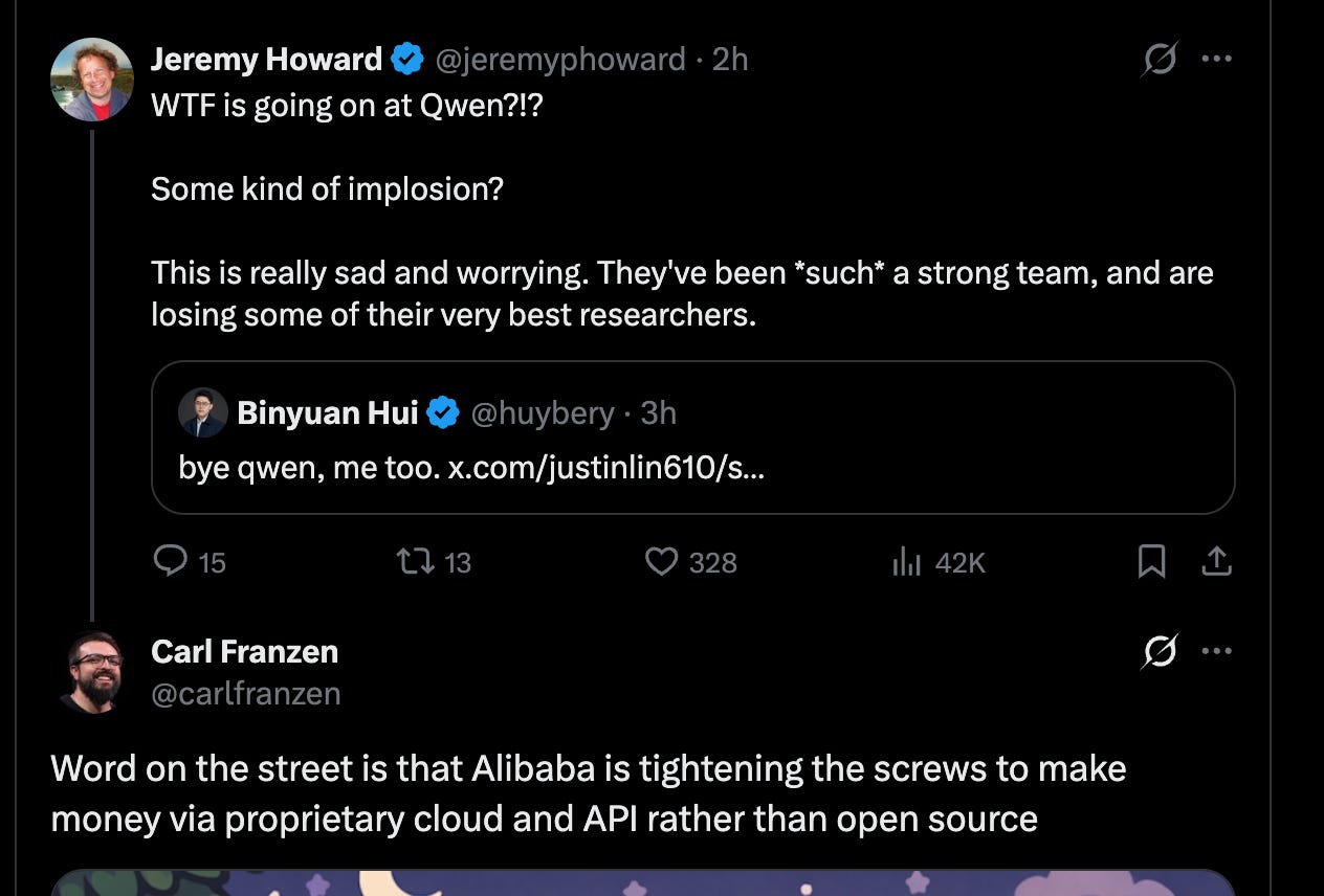Finally, the mass departures of many Qwen researchers due to what seems like internal politics is a massive, perhaps lasting, blow to Open Source.